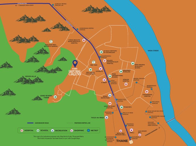 North Imperial Greens JP Infra Thane West is well situated off Ghodbunder Road, close to international-standard schools like Ryan International, hospitals, and shopping malls, also linked with highways and public transport, making commuting easy.